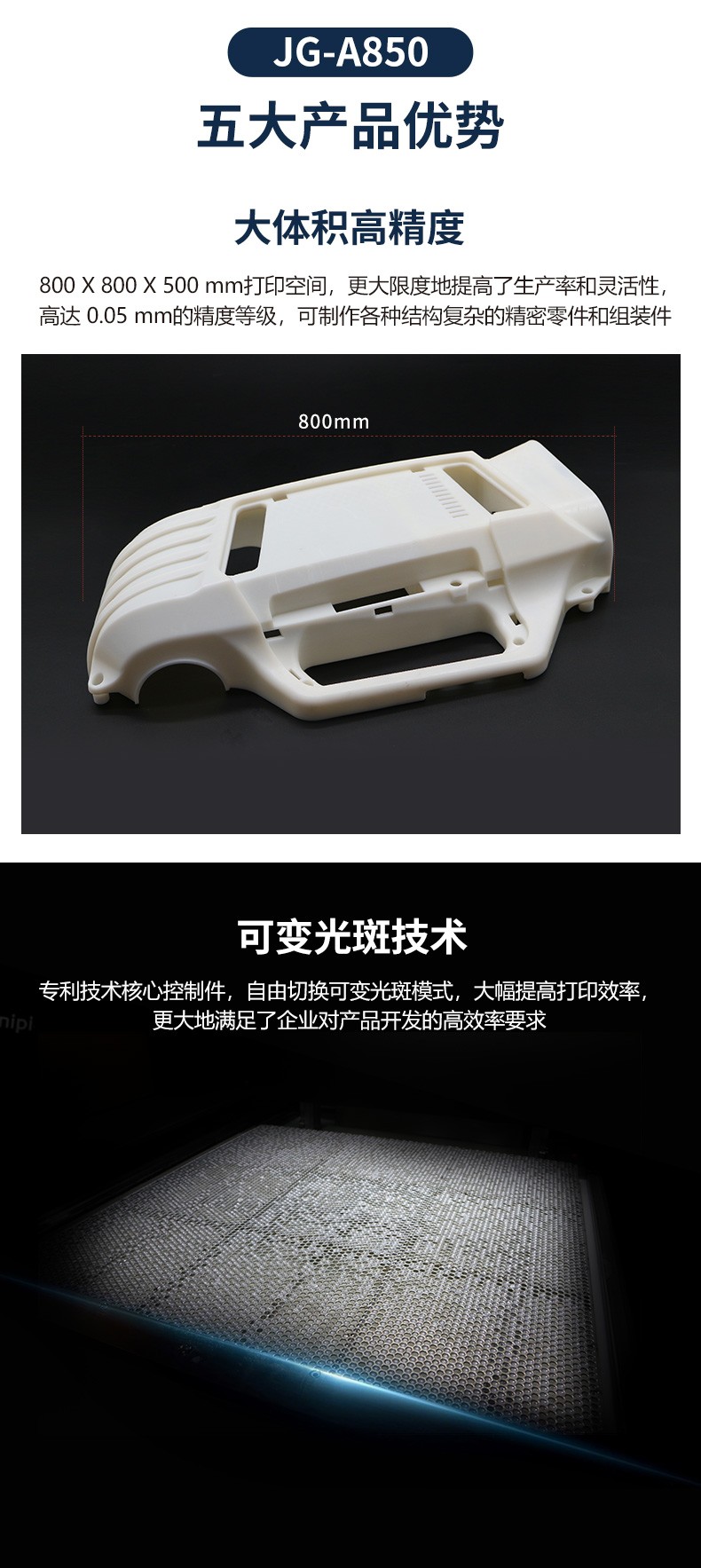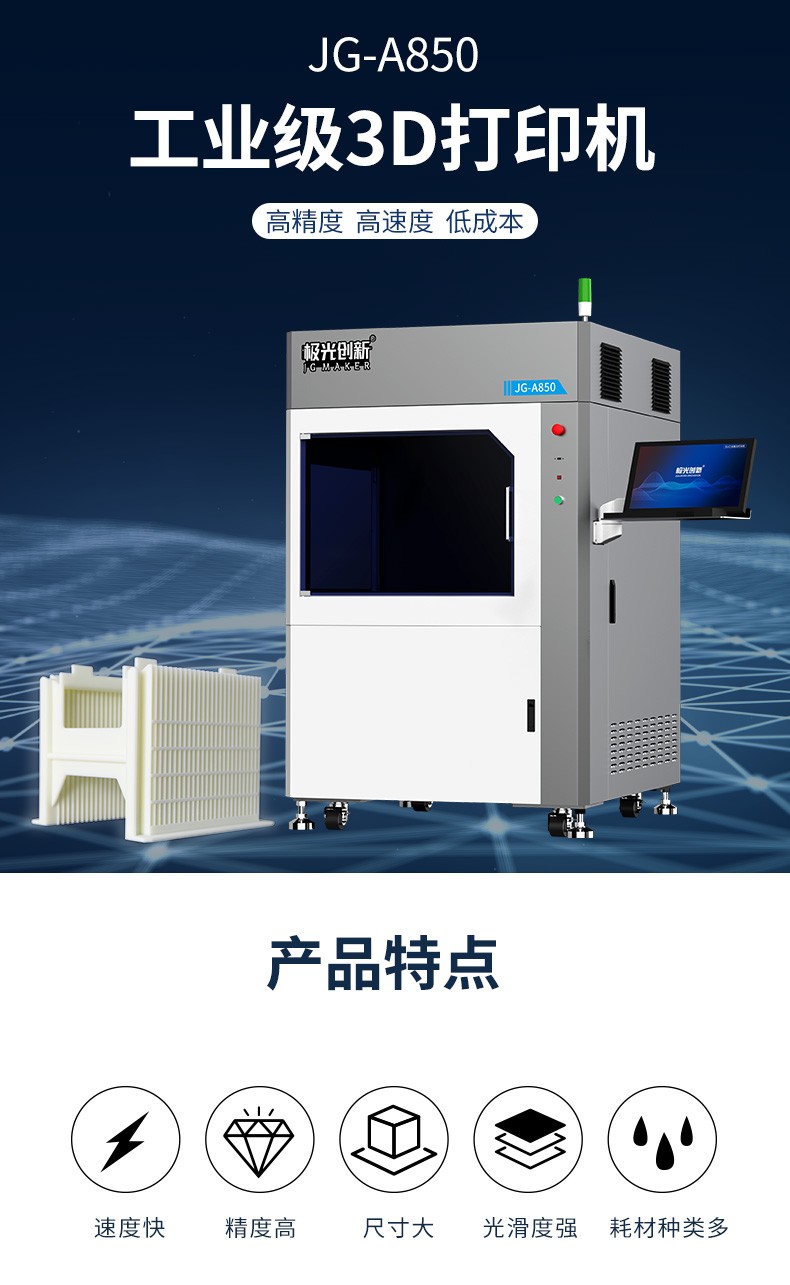 JG-A850 是極光創(chuàng)新自主研發(fā)生產(chǎn)的大尺寸工業(yè)級3D打印機(jī),擁有800*800*500mm的成型尺寸,可以快速成批量的制做精密零件和組裝件。